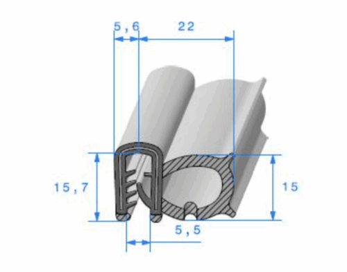 Profil à armature métal + bulbe cellulaire en EPDM – tôle 2 à 3 mm – l: 22 mm x h: 15,7 mm.